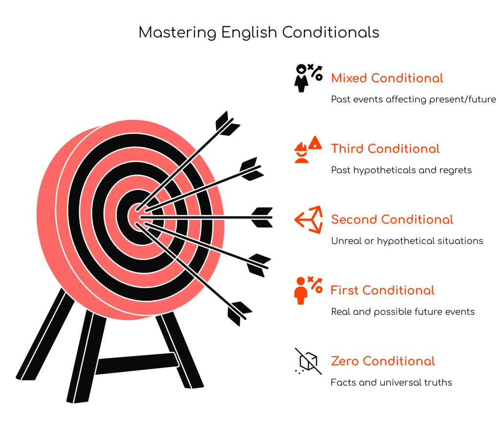Conditionals are grammatical structures that describe situations and their possible outcomes. They typically consist of an “if” clause (the condition) and a main clause (the result). Conditionals are classified into five main types, each serving a distinct communicative function.