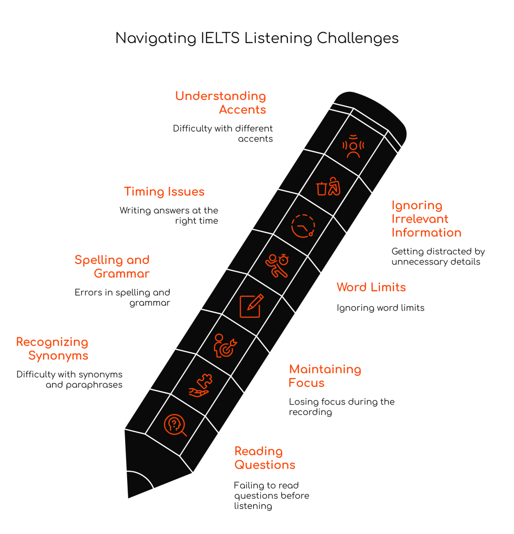 The IELTS Listening test features a variety of accents, including British, Australian, and North American. Candidates unfamiliar with these accents may struggle to understand.