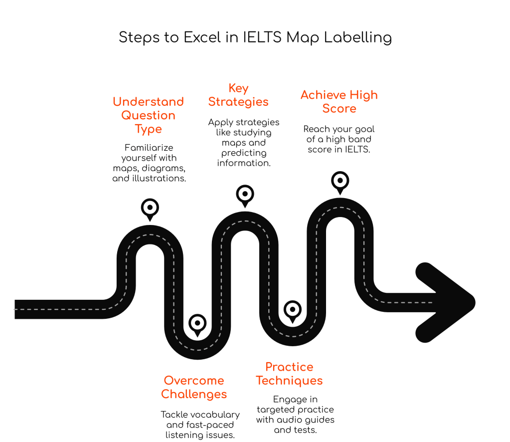 Excelling in labelling maps, diagrams, and illustrations in the IELTS Listening test requires a combination of attentive listening, visualization, and practice. By mastering directional vocabulary, predicting answers, and staying alert for paraphrasing and corrections, you can significantly improve your accuracy in this task. Incorporate these strategies into your IELTS preparation, and you will be well-prepared to achieve a high band score in the Listening section.