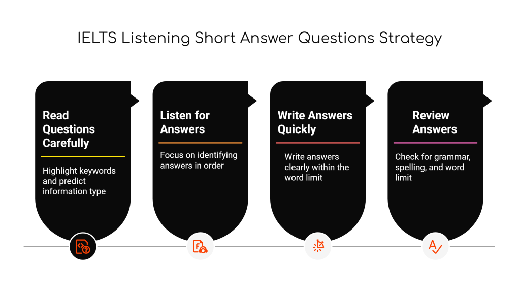 Short Answer Questions require you to listen for specific details in the audio and provide short written responses. You’ll often need to answer questions about facts, dates, names, reasons, or places.