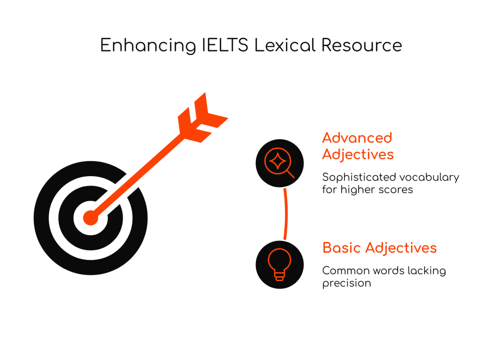 In IELTS Speaking and Writing, using high-level adjectives instead of basic ones can greatly improve your lexical resource score. Basic adjectives like “good,” “bad,” “big,” or “nice” are commonly used, but they often lack the precision and sophistication needed for a higher band score. In this post, you’ll find 100 advanced adjectives categorized by their simpler counterparts, with definitions and example sentences to guide your usage.