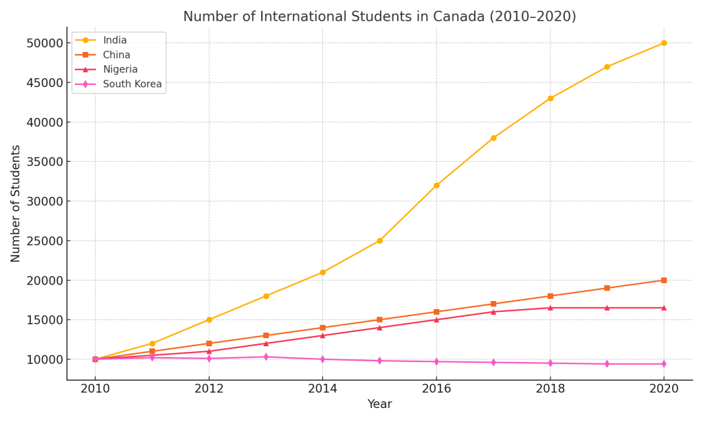 The graph below shows the number of international students from India, China, Nigeria, and South Korea who studied in Canada from 2010 to 2020.