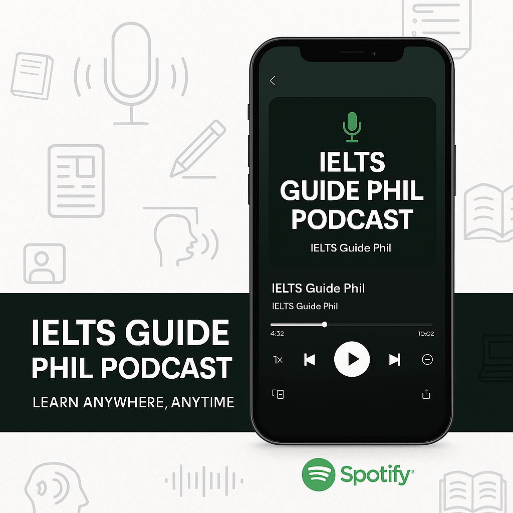 Preparing for the IELTS exam doesn’t have to mean hours in front of a screen or flipping through bulky textbooks. With the IELTS Guide Phil Podcast, you can now learn on the go — in your car, at the gym, or while relaxing at home. This audio series, written, created, and produced by IELTS Guide Phil, is the perfect addition to your IELTS preparation toolkit.