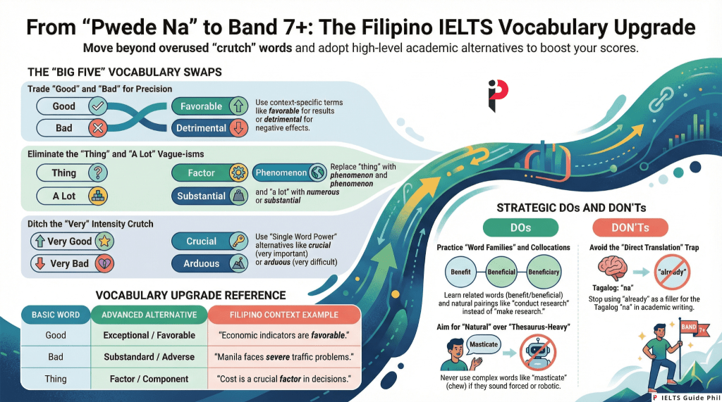 This is the “pwede na” syndrome—settling for vocabulary that’s technically correct but academically weak. For Filipino IELTS takers aiming for Band 7 and above, this is the silent score killer.
