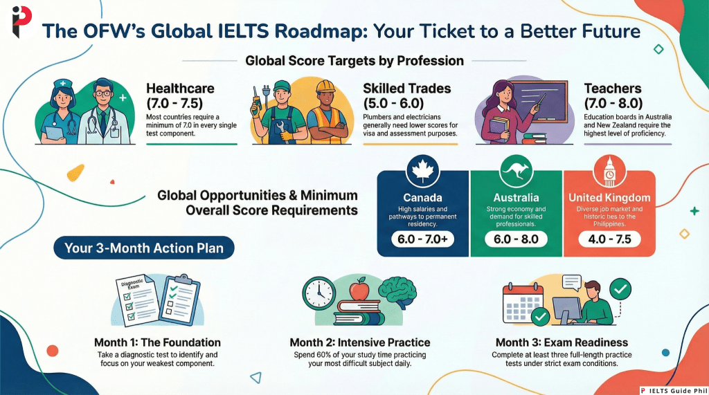Target Score for OFWs: Aim for IELTS 6.5-7.0 overall depending on your occupation.