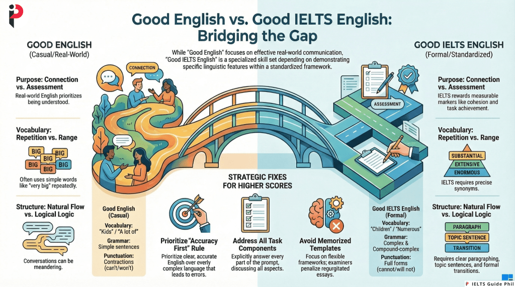 Understanding this difference is crucial for test success. While “good English” reflects your ability to communicate effectively in real-world situations, “good IELTS English” demonstrates your ability to meet specific assessment criteria within a structured testing framework. Let’s explore what sets them apart and how you can bridge the gap.