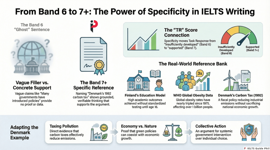 When you write “many governments have introduced various policies,” you are asking the examiner to trust your argument without giving them any reason to. When you write “Denmark’s 1992 carbon tax reduced industrial emissions without collapsing economic growth,” you are showing the examiner that your thinking is anchored in the real world.