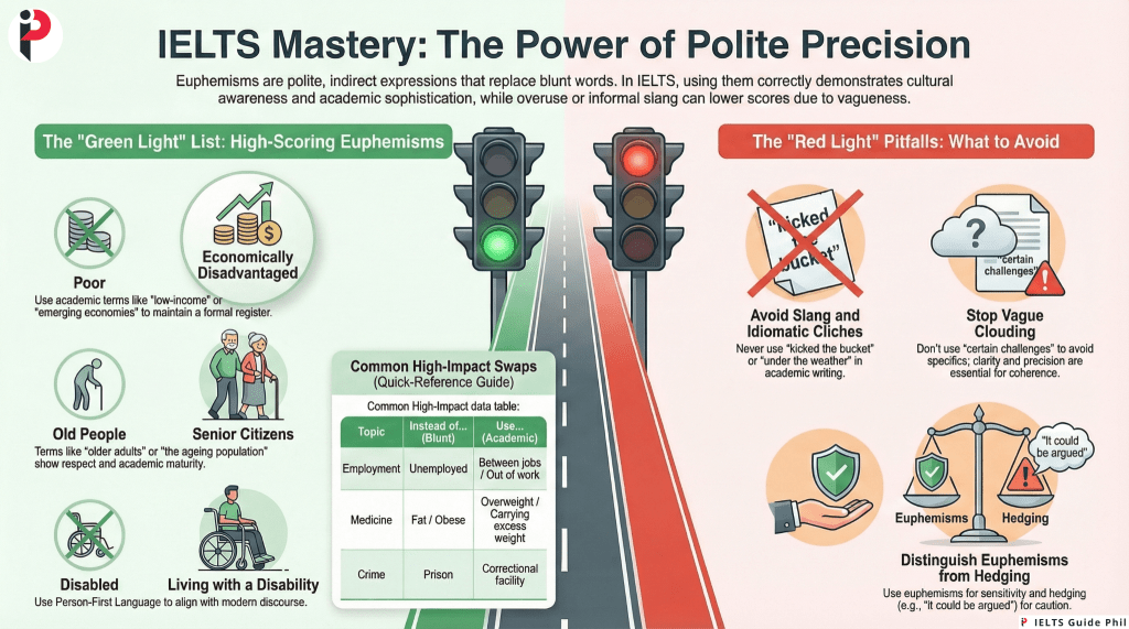 Whether you’re dodging awkward dinner-table topics or navigating sensitive global issues in your IELTS essay, euphemisms — those polite, softened substitutes for blunt or uncomfortable words — are everywhere in academic and conversational English. But here’s the trap thousands of IELTS candidates fall into: they either overuse them, sounding vague and evasive, or they avoid them entirely, sounding tactless and limited. This guide shows you exactly which euphemisms open doors in IELTS — and which ones quietly close them.