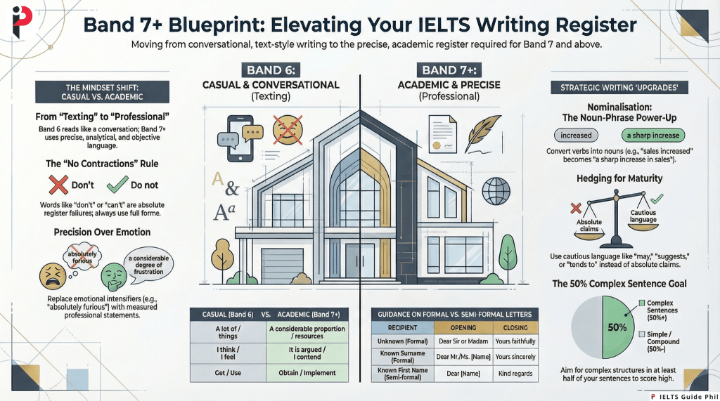 You can have brilliant ideas, solid grammar, and a wide vocabulary — and still score Band 6 because your writing reads like a conversation, a social media caption, or a motivational speech instead of a purposeful, controlled piece of academic or professional writing.