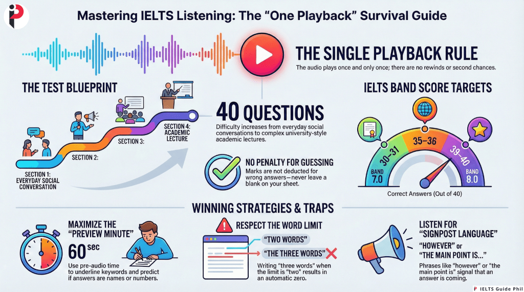 That single playback rule is what separates IELTS Listening from every casual English listening activity you have ever done. On YouTube, you can rewind. On Netflix, you can turn on subtitles. In IELTS, the audio plays, ends, and does not come back.