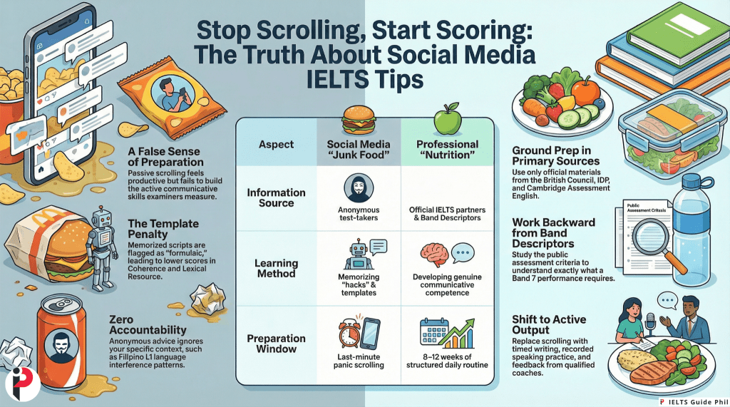 For Filipino IELTS candidates, L1 interference from Filipino and Tagalog is already a documented challenge — particularly in pronunciation, grammatical structures (verb-subject-object patterns, omission of articles, use of “po” discourse fillers), and writing register. Social media tips do not address these specific transfer issues. They offer generic advice that was not designed with Filipino language patterns in mind. Following generic tips while your specific challenges go unaddressed is like taking vitamins when what you need is surgery.